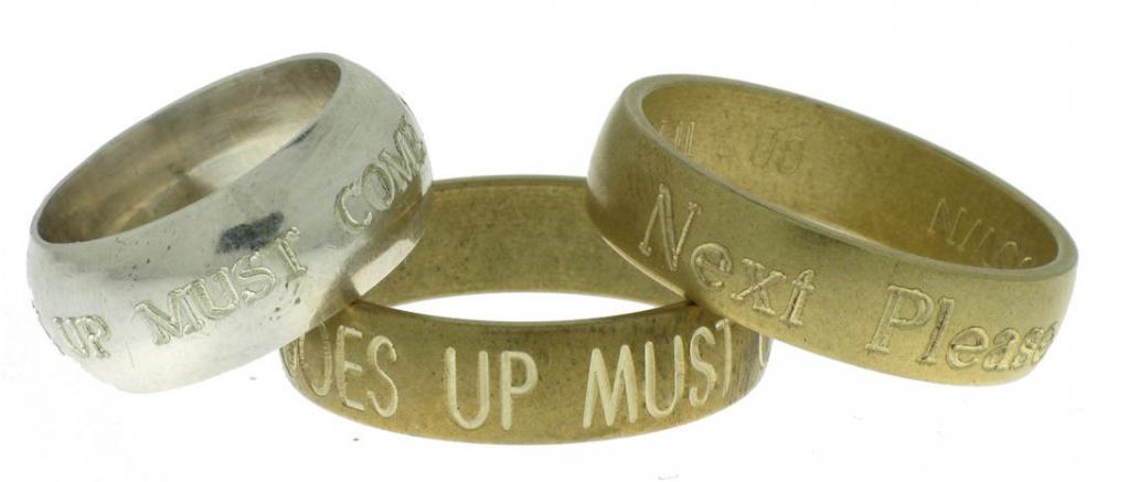 With our engraving machine we can do the inside of rings in different fonts (e.g. cursive or block letters). Examples are given above and here. These machine-made engravings cost 1,50 - 4 Euro per character (8 Euro minimum even for 1 letter !)